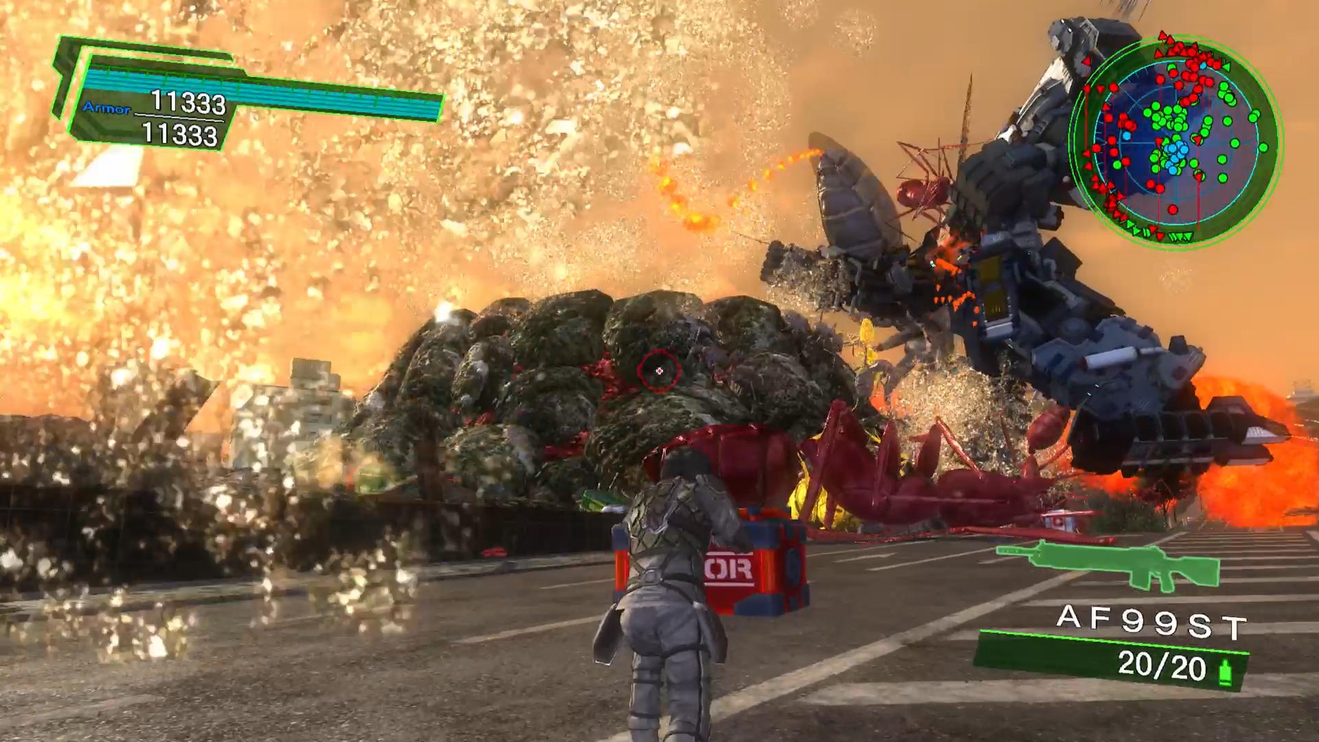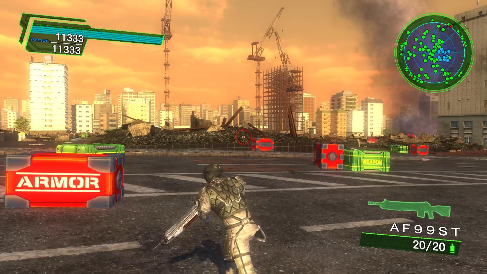 ――ちなみに。地球防衛軍シリーズでは、敵を倒すたびにその場にアイテムが落下するが、この表示数には上限があり、限界値に達すると、「新しいアイテムが落ちない」という状態になる。よくある「最も古いアイテムから消えていく」ではなく、目の前の敵が“落とすはずのアイテム”を落とさなくなるため、すぐ回復を回収できなくなるなど、戦術上、大きなデメリットと化す。もちろん、稼ぎ効率的にも好ましくない…。何故か最新の『6』でも改善されていない。とりわけこのミッションは、異様な敵の多さと味方火力により、恐らくだが、全ミッションで最も表示限界に達しやすいだろう。よって、味方の回復とアイテム稼ぎ、その両面で、戦闘中もどんどんアイテム拾いを進めていく。