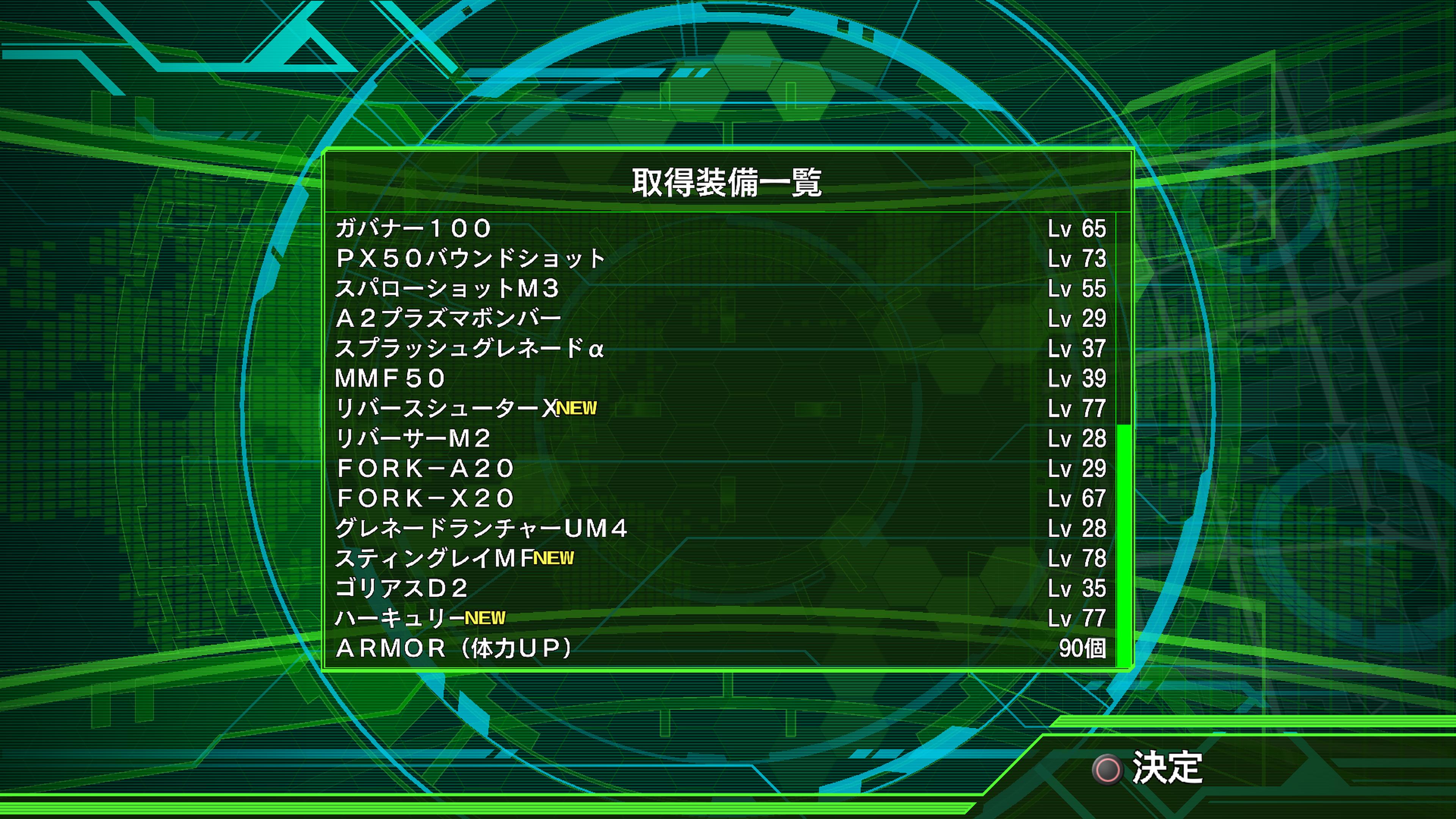 さて。このミッションの武器ドロップは、“DLC2のラスト1つ前”ということで、それはもう豪華である。地球防衛軍4.1の時点では、INFERNOでの新武器こそ無いものの(DLCでLv100超えの新武器が登場するのは『5』から)、それ以外の難易度ならば、上位レベルに相当する武器を手に入れられる。例えば、HARDESTだと、Lv85までの武器を入手可能だ。Lv85には、「AF100」が存在し、『4』の最終アプデから更に強化された主力武器の一つとして、大活躍をしてくれるであろう。稼ぎやすさもありがたく、「超強力な味方部隊&弱体化補正を受けた敵」という構成(※敵は、弱体化補正を受けていても、落とすアイテムの数と質は下がらない)は、稼ぎプレイに最適であり、頭を空っぽで戦っても勝てるくせに、最高級のドロップアイテムを、ごっそり手に入れられる。まさに、「DLCを含む番号順での通しプレイ」にこだわってきた私にとって、最高級のご褒美ステージと言えるのだ。
