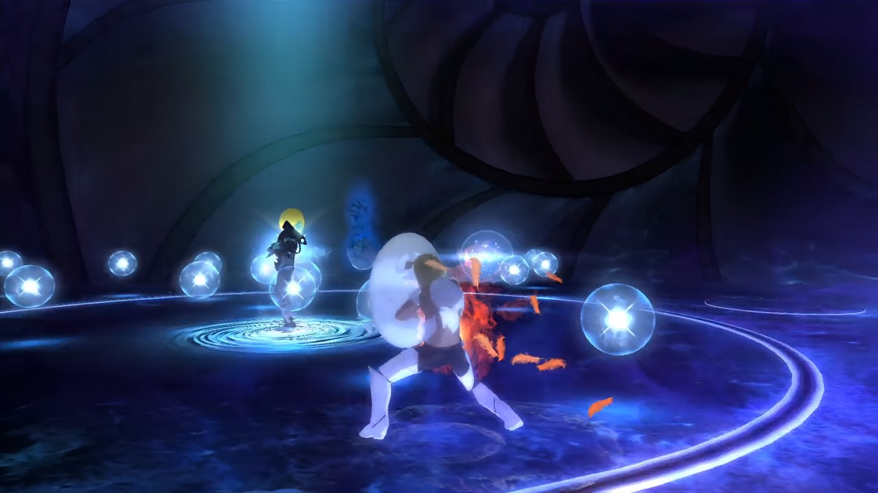 明るい地底湖という感じの水中へと潜り込む。敵は大技の溜めを行っており、それを阻止するために、プレイヤーたちも後を負う…という感じだ。