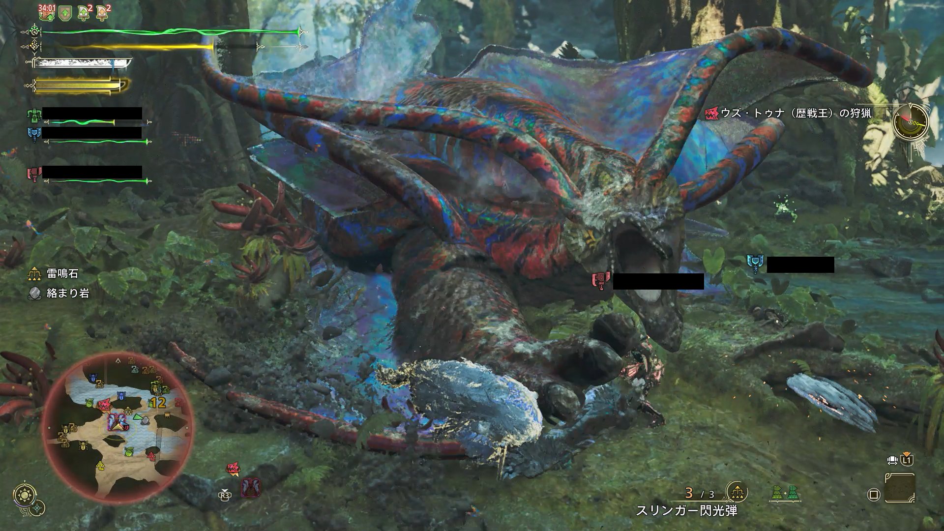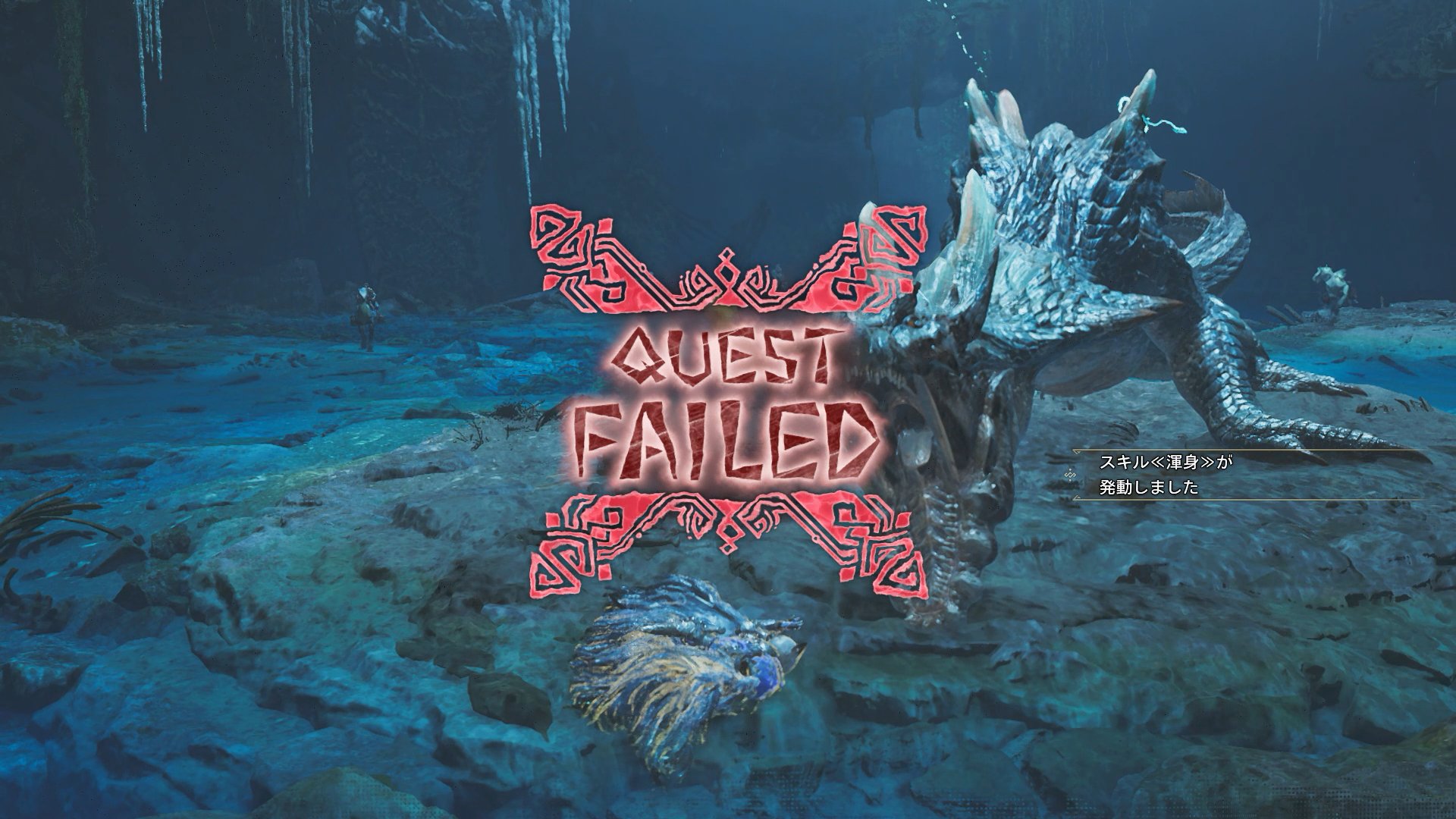 強力な歴戦個体を相手どった場合であっても、この水中戦は存在する。そして、いつもと違った戦闘形式に加えて、歴戦★8の高火力も相まって、割とバタバタ死者が出て、普通にクエスト失敗になる。こういう、“普段と違う操作性のところが難しい”のは、ミニゲームにトロコンを阻止されるといった感じで、特有の不快感があるな…。