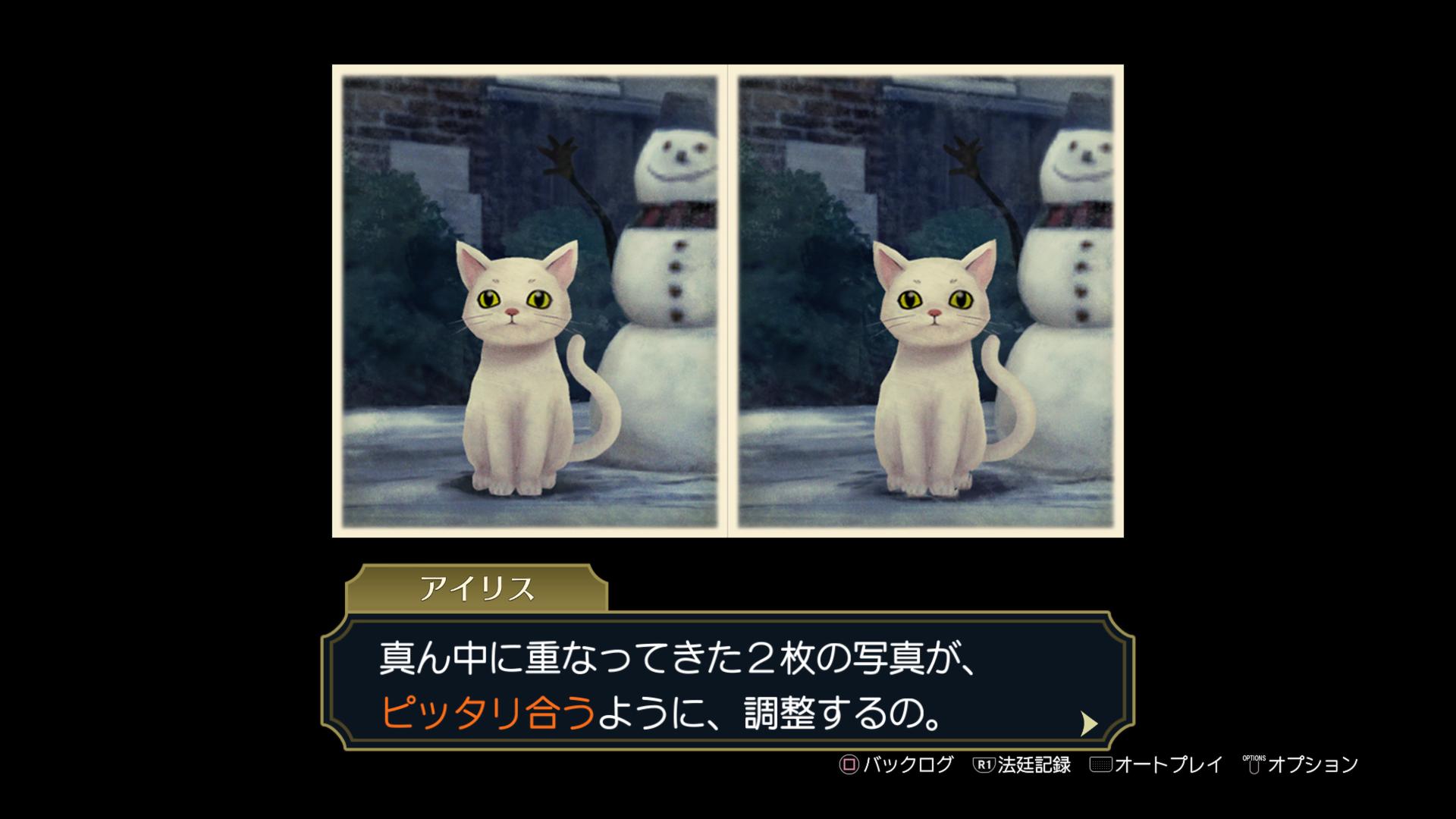 ――ちなみに。その後、大逆転裁判は、まずスマートフォン型携帯電話に移植されたのち、PS4やスイッチなどで「1&2」としてリマスター版が登場した。それらの機種では、裸眼3D機能が存在しないため、3D立体視のシーンは、上の画像のように、“写真が2枚並んでいる”というシーンになっている(逆に、3DS版が、1枚の立体写真が登場するだけ、とも言える)。なお、その際のセリフや演出も、細かく書き換えられているらしく、【こちらのサイト様】によると、3DS版のホームズは、「“3Dボリューム”を《ON》」という、世界観を放り投げた発言をするらしい。一方で、その後の移植版においては、「君がその絵を立体的に見るには」という、やや引っかかる表現となっており、その違和感で、私は「ああ、3DS版から移植するときに、セリフが変えられたんだろうな…」と気付くことができた。