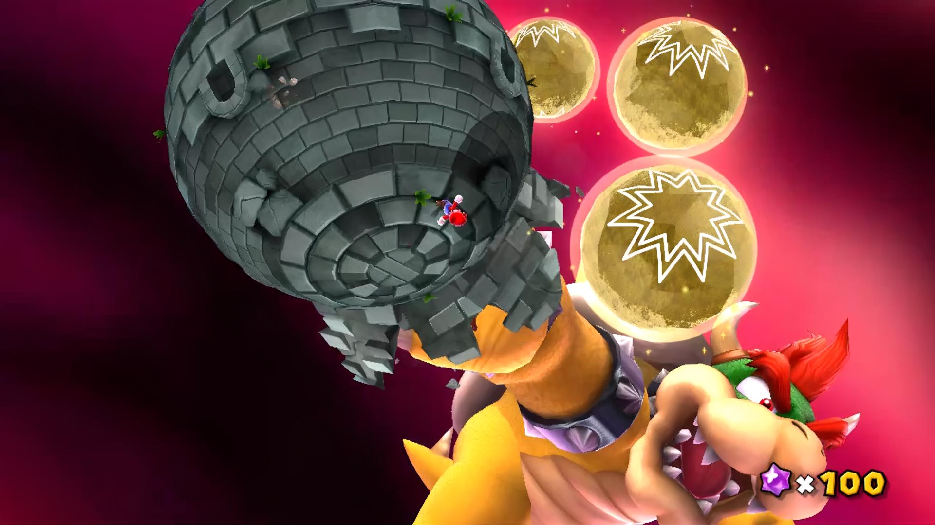 第1ワールドのボスはクッパJr.であったが、今回はクッパさま本人が降臨である。まず、ステージは、溶岩の海に石の砦が並んでいる…という、強そうな雰囲気である。しかしながら、このゲームは3Dマリオということで、溶岩に落ちても即死せず、1ダメージで飛び上がるため、見た目ほど難易度は高くない。途中、謎のクリーチャーが足場をバクバク食べて宇宙へと落下させようとする地点では、“カメラが自然に真上から見下ろす形”となり、「宇宙的な浮遊感」と「ジャンピングアクションとしての厳密性」を同時に実現してくれた。さすが、アクションゲームの手練れと思わせるような作りである。