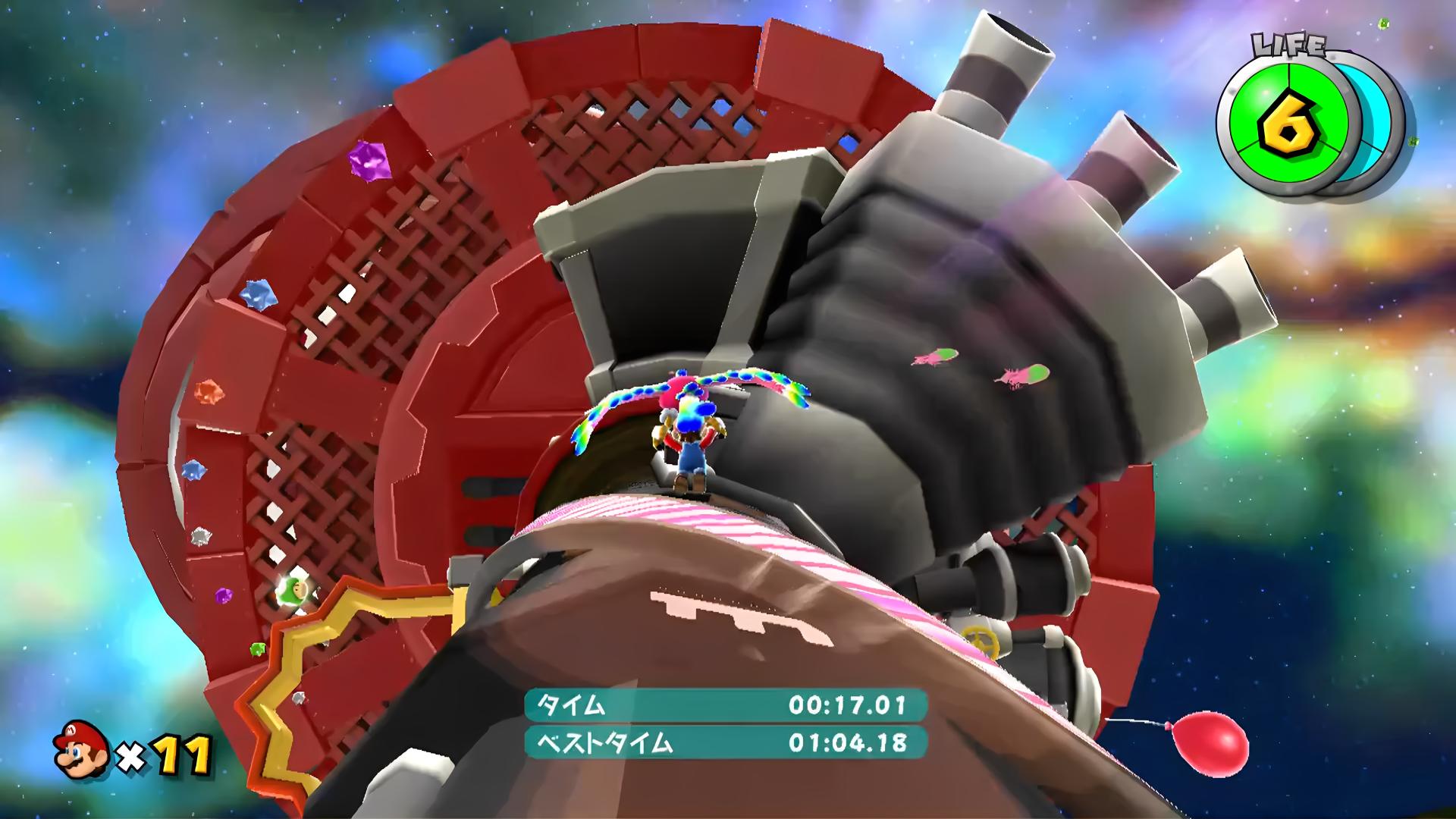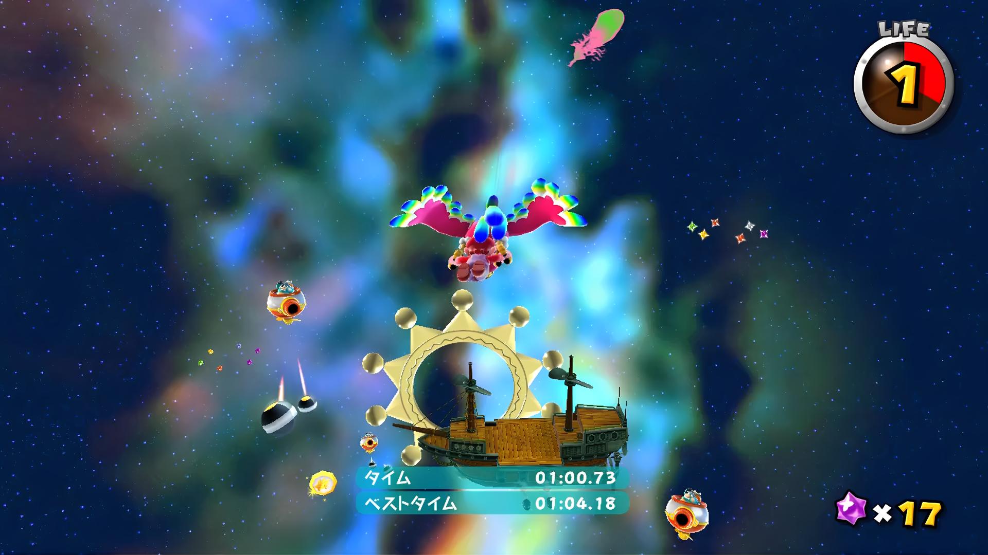そんなわけで。畜生な1つ目・2つ目のゲートさえ乗り越えれば、この手のステージの恒例として、中盤以降はグッと難易度が下がる。まあそれでも、ドッスンの下をくぐったり、キラーを避けたりなどと、不慣れなジャイロ操作での難関が続くため、決して気は抜けない。それらを耐えて、残り3つのゲートをくぐれば、無事に彗星メダルを獲得してクリアーである。は〜い、おめでとうございました…。