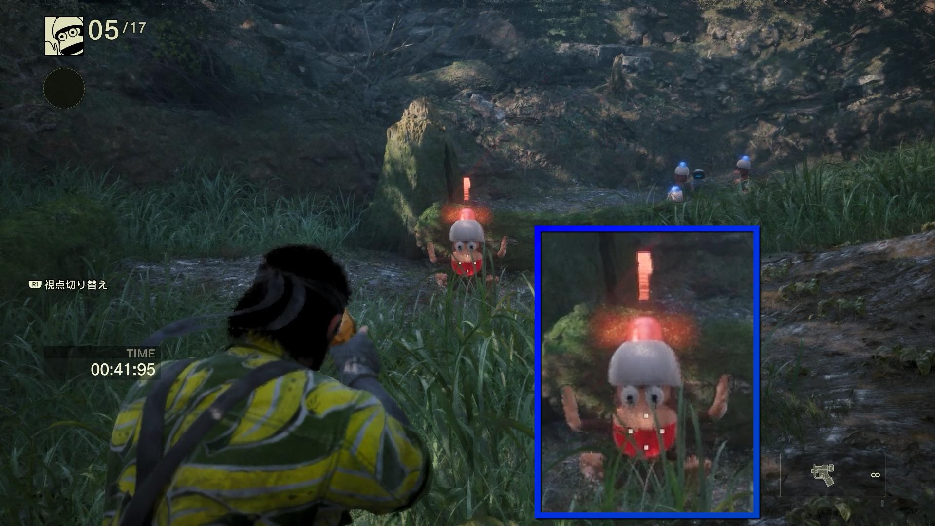 さて。そんな猿蛇合戦だが、まず、アクション面は大幅に進化している。「サブシスタンス」ではない原作では、カメラとスネーク目線が完全に別であり、銃で狙いを付けながらの移動もできなかったため、まずピポサルに接近し、そのあと足を止めて狙い始めるという、非常に非効率な操作性でのプレイとなった。まあ、タイムアタックをするとなると、実際のところはほとんどスタングレネード(閃光手榴弾)を使うらしいが、とにもかくにも、移動と狙いが両方が要求されるスタイルが、当時のメタルギアの操作性と、まるで噛み合っていなかったのである。