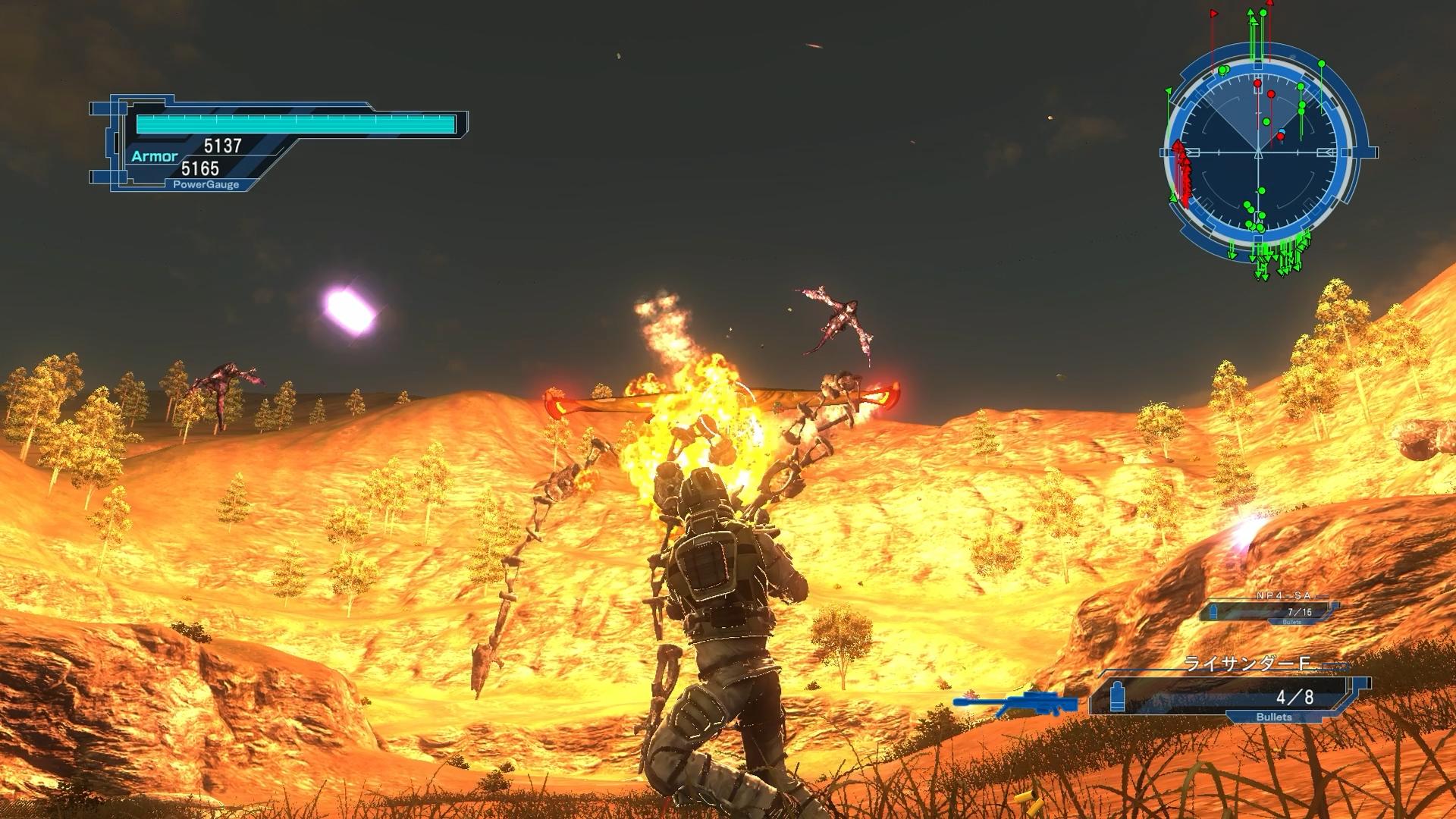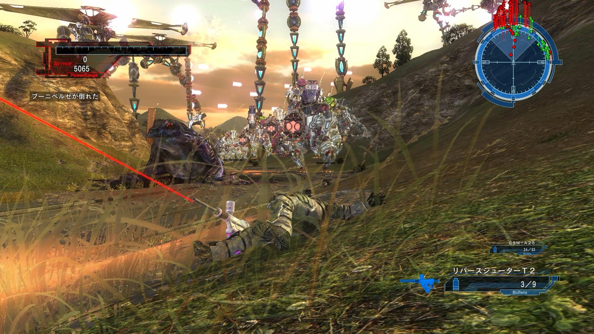 ――しかし、その楽勝ムードを完全に打ち破るのが、第3波であり、ディロイと鎧カエルの大群が、四方八方から襲い掛かる。登場こそ離れているものの、山の影に隠れて接近してくるため、同時に多数を相手にするような状態となる。敵は、終盤ミッションということで補正係数が高く、火力・耐久力ともに段違いだ。加えて、途中からは、強力な紫タッドポウルの増援も到着し、どうしようもならなくなる。ミサイルや連打系の銃など、様々な武器を試してみたが、だいたい展開は同じであり、火力戦で撃ち負けて、第3波で終了するのだ。