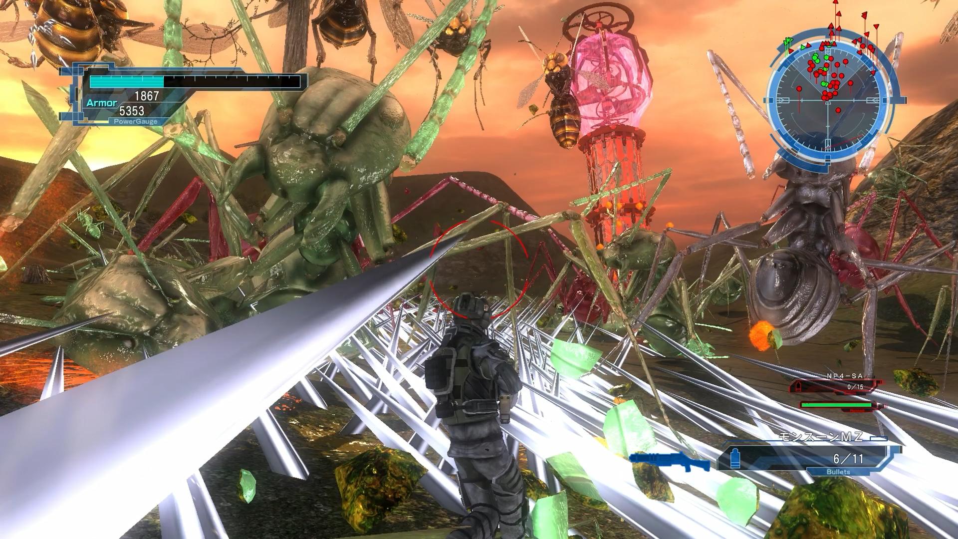 …具体的に言うと、3つあるアンカーのうち、どのグループに手を出しても負ける。鎧大蜘蛛なんかは1匹でも敗北しうるので、最初に戦うなどというのは有り得ない。金女王のグループは、途中の緑蟻の猛ラッシュが尋常ではなく、もはやアンカーに弾を通す隙などまるで存在しないレベルだ。意外なのが、女王蜂のグループであり、HARDの時は大したことが無かったが、HARDESTでは針の発射数が大幅に増えており、遮蔽物の無い山中では回避しようが無い。それで転倒したところに、HARDESTから追加された赤蜂がラッシュを仕掛けてきて、数千の体力が一瞬で溶かされる。変異種ですらない女王蜂が、ここまで強いと感じたのは、初めてだ。