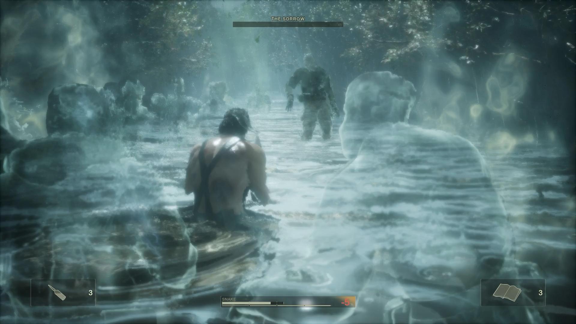 …まず、前回も触れたが、ザ・ソロー戦では、銃などによる攻撃が無効化され、“ここまでのプレイでスネークが殺してきた敵兵たちの霊”を避けながら進むことになる。勝利条件は、「ゲームオーバー画面で蘇生薬を使うこと」である。道の最後まで行って、ザ・ソロー自身の死体に触れてゲームオーバーになり、そこで蘇生薬を使えば、迷彩服の「スピリット」が手に入るが、そこまでしなくとも、開始地点で潜って溺れて、即蘇生をすれば良い。そのような都合上、各種の攻略などでも、ボスとして扱われないことが多いくらいだ。