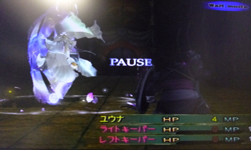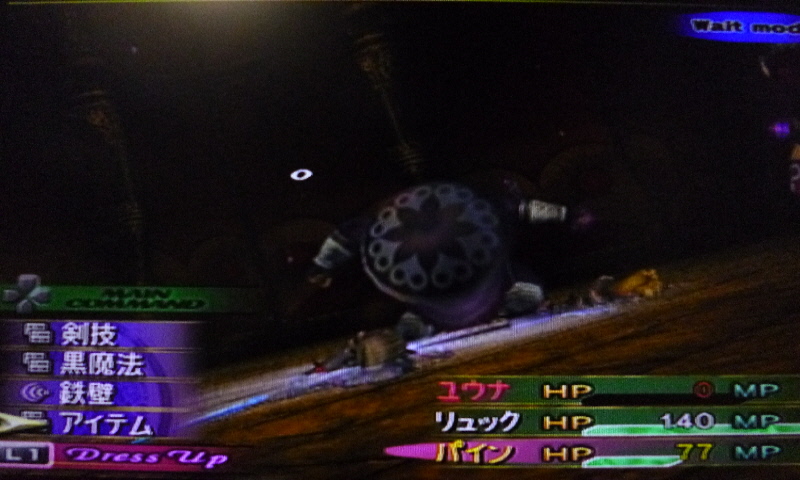 ユウナがノーマルドレスに戻った直後、パインはここで斬騎王にドレスアップ。こちらも防御力が貧弱なので3人にタコ殴りにされるとすぐに戦闘不能になります。右之翼はウノ―に「暗闇!」を使った後は余計なAP入手を覚悟で「体力!」による回復、左之翼はひたすら「非力!」を連打。