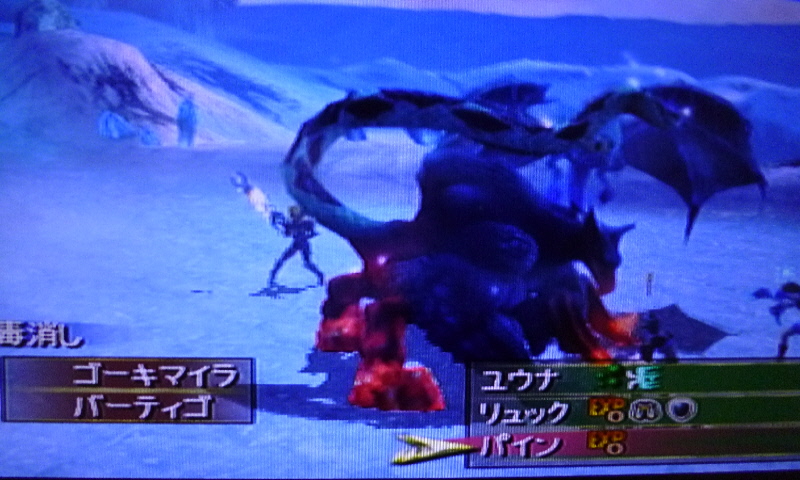 勝つだけなら実は楽勝。バーディゴの攻撃や、ゴーキマイラの「突撃」のダメージはゴーキマイラの属性攻撃を吸収することで十分リカバリーできます。後はひたすらにパインで殴ります。攻撃力が貧弱(ブラックベルトの+20だけ)なので時間がかかりますが、カーソル位置「きおく」でコントローラーを輪ゴム等で○ボタンに固定しておけばオート戦闘で撃破できます。