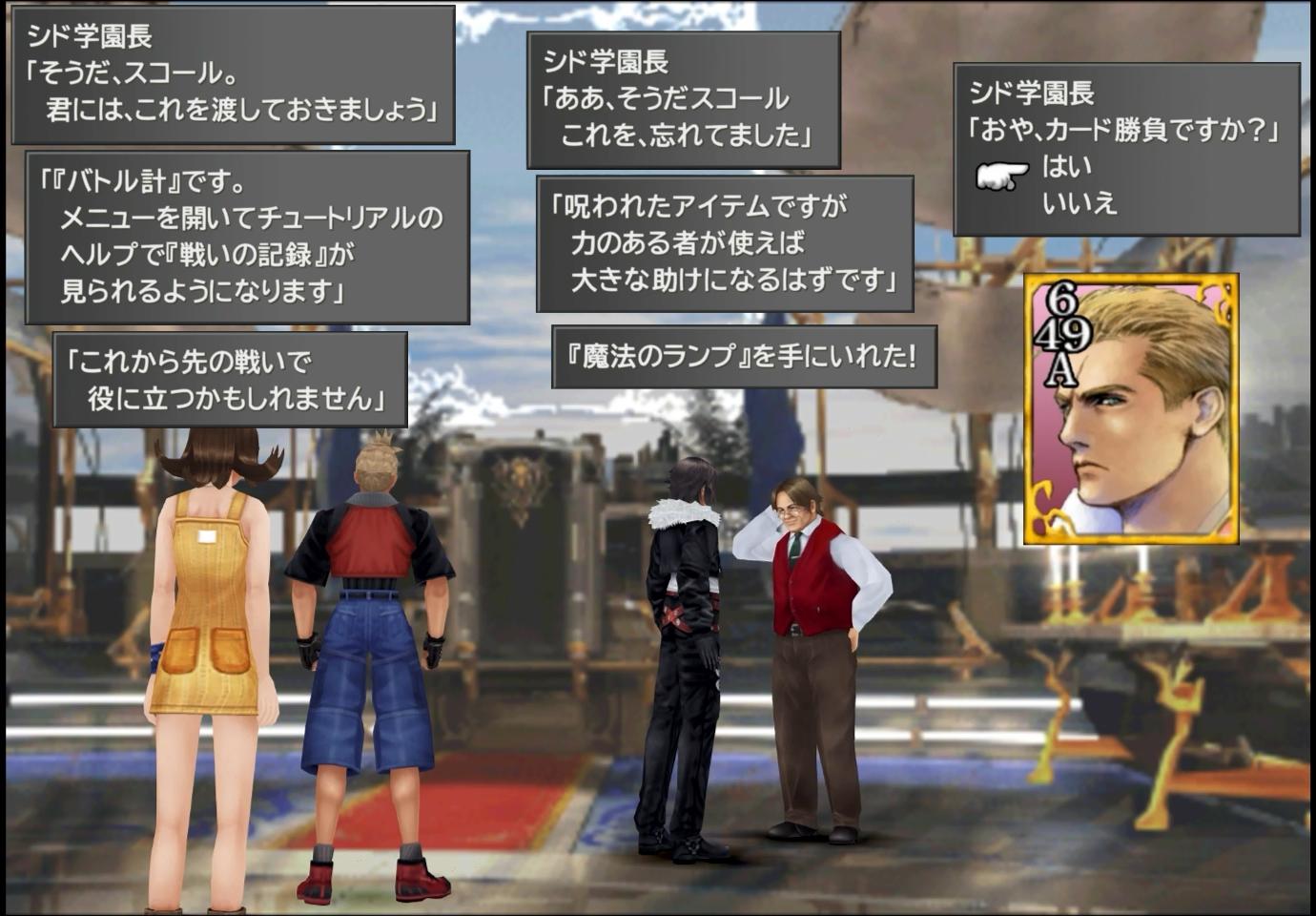 …しかしながら、そのあと学園長室に行くと、シドが先回りをしている。ここが、「サイファーのカード」の最速入手タイミングであることは、最近では割と知られているらしいが、「バトル計」のほうについても、未入手であれば受け取ることが可能だ。さらに、「魔法のランプ」を貰っていなかった場合、そちらの救済も為される。というわけで、何の戦略的意味も無いが、「@バトル計」「A魔法のランプ」「Bサイファーのカード」と、この時点でのシド関連のイベントを、同時に3つ済ませることもできるのだ。100%系のRTAで使える…かもしれない。