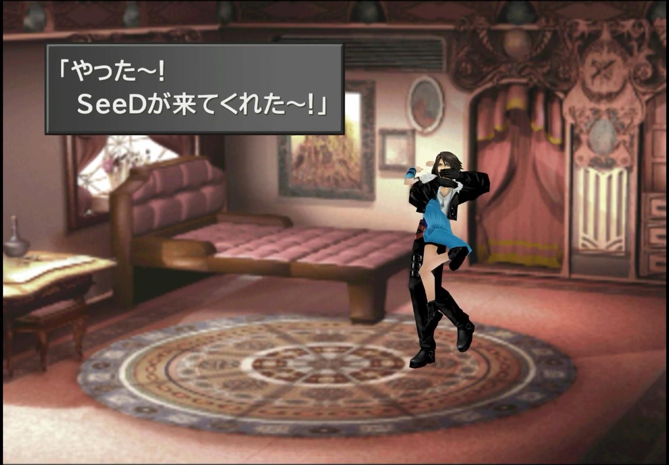 …そして、次の日。我らが美少女:セルフィが、開けんかいゴラァ!して起こしてくる。なんだこいつ、リア充(死語)かよ…。そんな感じで、私服に着替えてゲート前まで出かけると、シドからSeeDとしての初任務を言い渡される。どうやら非常に低賃金で請け負ったらしいが、スコールたちに、単純な軍人になってほしくないという、教育的な意味があったことがうかがえる。