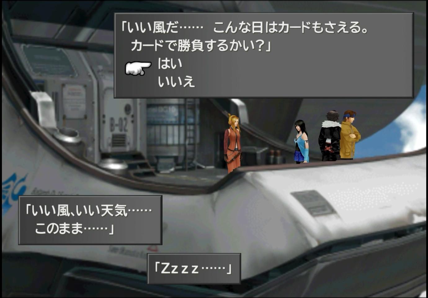 ――そして、ここでの注目ポイントは、シュウではなく、その奥の扉だ。リノアの例のムービーや、F.H.への入口に使われるベランダであるが、このタイミングで向かうと、黄色ジャンパーの男がくつろいでいる。何気に、バラムガーデンでは、初のボスカードの使い手であり、私は、ゲーム冒頭でカードを7枚くれた人(CC団のスペード)だと思っていたが、それとは別人のようである。ガーデンが大混乱のなか、なぜこのような場所に居たのかというと、フラグ管理が曖昧でこの後の時間軸が混ざってしまったため風を感じていたということである。大物すぎる。そして2回目に話しかけると「Zzzz……」と寝ている様子が見て取れる。“戦いに参加しないのが一番の抵抗”という思想を表現している…のかもしれない。