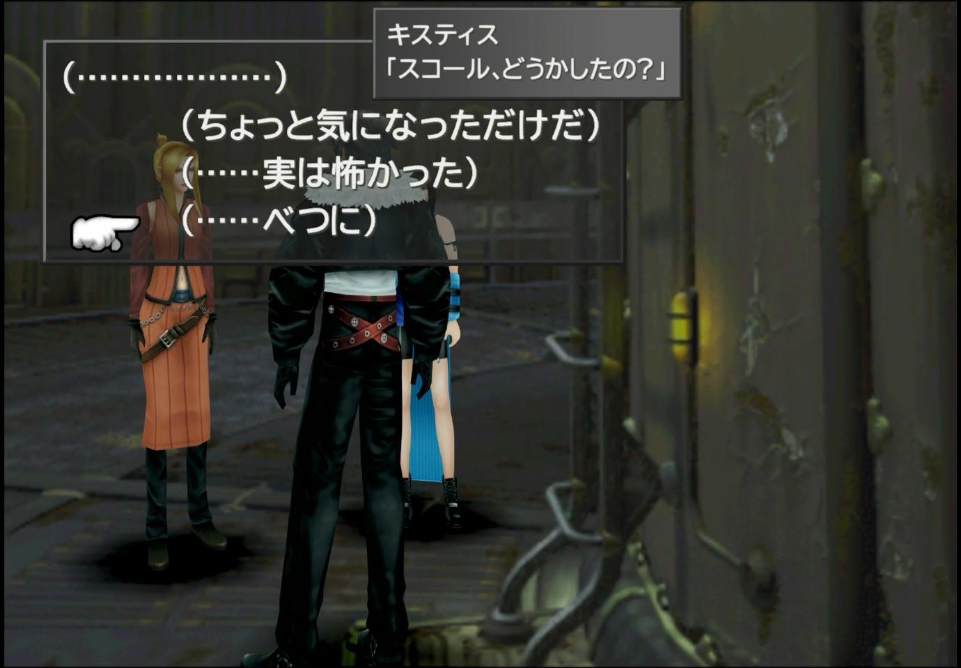 その後は、「属性攻撃J」を持っているかどうか質問し、(いや、まだない)を選んで何もしないスコールを見た後、MD層内部の探索を進めていく。なお、「属性攻撃J」自体は、現時点でもケツァクウァトル・シヴァ・イフリート・ブラザーズと、多くのG.F.が覚えるが、何かのアビリティの派生かつ160APが必要ということで、覚えていない人も多いだろうが、それについてのアドバイスは特にしてくれない。ちなみに、どちらかというと、火力が上がることより、無効や吸収によって敵が倒せなくなったときの嫌さが印象に残るアビリティだ。イフリートのカードをカード変化して「エレメントアタック」にすることにより、ごくごく序盤から使用もできるが、それをする人は聞いたことがない。