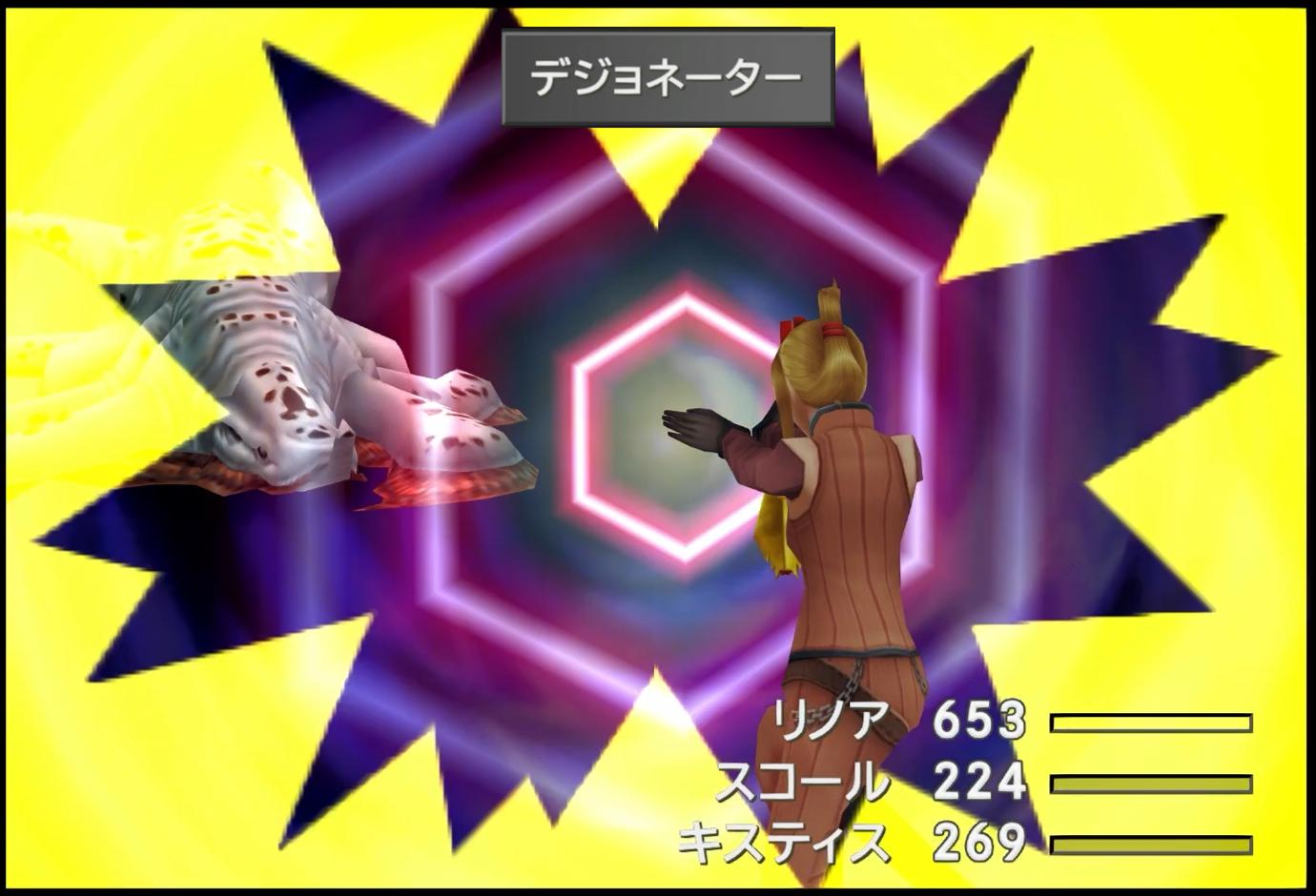 ――ちなみに、デジョネーター以外の弱点だが、炎を2倍弱点としているほか、割合ダメージが有効である。炎属性の攻撃技と言えば、キスティスの「ファイアーブレス」が存在するが、習得にはルブルムドラゴンから得られる「火竜の牙」が必要であり、この時点で使うならカード変化(10枚)が必要である。炎魔法精製でフレア×20個にも変えられる需要の大きな素材なので、キスティスをメインで使わない場合は、ちょっと勿体ないかもしれない。また、割合ダメージが有効ということで、ゼルのメテオストライク連打を使えば、一撃必殺ないしそれに準ずるダメージを与えられる。しかし、今回プレイでは、ゼルのデュエルは各DISCで1回の切り札であり、温存しておきたい。というかそもそも、ゼルはミサイル基地に行っているので、使えない。