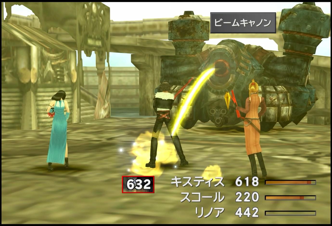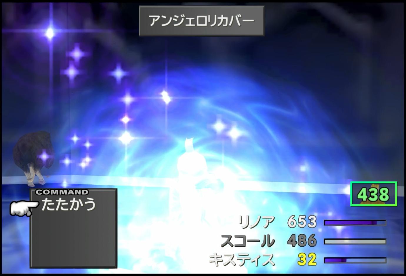 いっぽうで。実戦で活躍してくれたのは、リノアだ。この時点での「コンバイン」では、ウィッシュスター以外の3つ、つまり「アンジェロキャノン」「アンジェロストライク」「インビジブルムーン」を発動できる。今回プレイでは、「コンバインというコマンド」ではなく、出た技名で管理しているので、被ってしまったらリセットとなるものの、3回まで特殊技を使えることになる。まず、「アンジェロキャノン」は、通常、インビジブルムーン狙い時のハズレ技としてヘイトを集めているが、打撃の約4倍のダメージを与えられる。また、ランク2技の「アンジェロストライク」は、単体攻撃であるものの、これまた打撃の約6倍のダメージが出る。今回プレイでは、「たたかう」も重要になるというということで、その数倍のダメージを出せる技が弱いわけがない。なお、実際には、アンジェロキャノンがクリティカルヒットをし、更に2倍のダメージを叩き出せた。